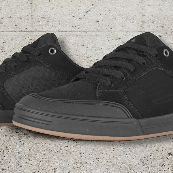Parte superior de gamuza negra junto con detalles tonales sobre una unidad de suela negra y goma